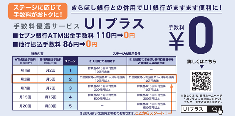 UI銀行担当者: 「『UIプラス』(https://www.uibank.co.jp/service/uiplus/)は、お客さまの総預金の1ヵ月平均残高に応じてステージが設定され、ステージが上がることで他行への振込手数料の無料回数が増える優遇や、セブン銀行ATM、コンビニATM及び、ゆうちょ銀行ATM利用手数料の月の無料回数が増える優遇サービスです。例えば、給与振込をUI銀行に設定するだけで口座の平均残高が増えるためステージがアップし、よりお得な条件でお取引ができるようになります。